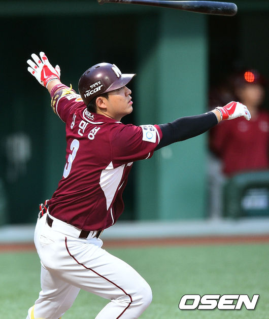8일 오후 충북 청주구장에서 열린 2014 한국야쿠르트 세븐 프로야구 한화 이글스와 넥센 히어로즈의 경기,3회초 1사 2루 넥센 김민성이 2점 홈런을 날리고 있다.