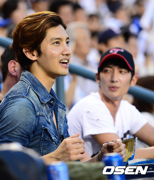 8일 오후 서울 잠실구장에서 열린 2014 한국야쿠르트 세븐 프로야구 LG 트윈스와 두산 베어스 경기, 동방신기 멤버 최강창민이 객석에서 경기를 지켜보고 있다.