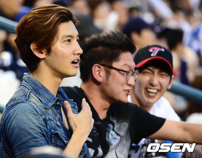 8일 오후 서울 잠실구장에서 열린 2014 한국야쿠르트 세븐 프로야구 LG 트윈스와 두산 베어스 경기, 동방신기 멤버 최강창민이 객석에서 경기를 지켜보고 있다.