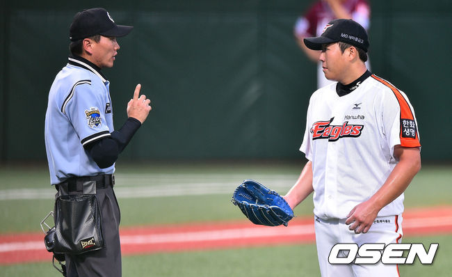 8일 오후 충북 청주구장에서 열린 2014 한국야쿠르트 세븐 프로야구 한화 이글스와 넥센 히어로즈의 경기,3회초 윤석민에게 몸에 맞는 공을 던진 한화 선발투수 송창현이 권영철 구심에게 주의를 받고 있다.
