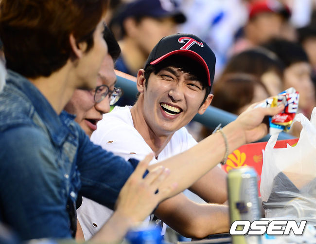 8일 오후 서울 잠실구장에서 열린 2014 한국야쿠르트 세븐 프로야구 LG 트윈스와 두산 베어스 경기, 동방신기 멤버 최강창민과 야구장을 찾은 트랙스 멤버 정모가 미소짓고 있다.