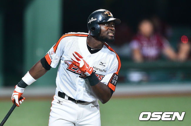 8일 오후 충북 청주구장에서 열린 2014 한국야쿠르트 세븐 프로야구 한화 이글스와 넥센 히어로즈의 경기,3회말 2사 만루 한화 피에가 홈런성 파울타구를 바라보고 있다.