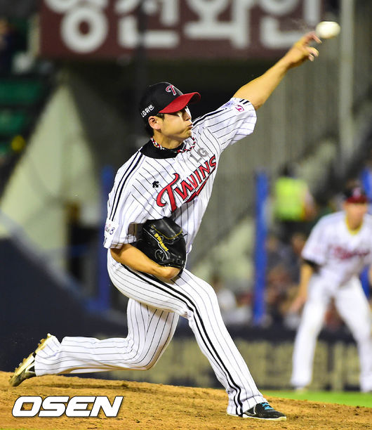 8일 오후 서울 잠실구장에서 열린 2014 한국야쿠르트 세븐 프로야구 LG 트윈스와 두산 베어스 경기, 5회초 LG 신재웅이 힘차게 공을 뿌리고 있다.