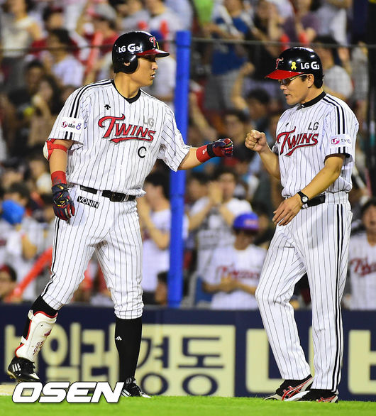 8일 오후 서울 잠실구장에서 열린 2014 한국야쿠르트 세븐 프로야구 LG 트윈스와 두산 베어스 경기, 5회말 무사 1,3루 1타점 적시타를 날린 이진영이 1루에서 김민호 코치와 하이파이브를 나누고 있다.