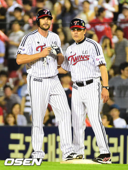 8일 오후 서울 잠실구장에서 열린 2014 한국야쿠르트 세븐 프로야구 LG 트윈스와 두산 베어스 경기, 5회말 1사 2,3루 두산 변진수의 투구에 맞고 1루로 출루한 스나이더가 김민호 코치로 부터 격려를 받고 있다.
