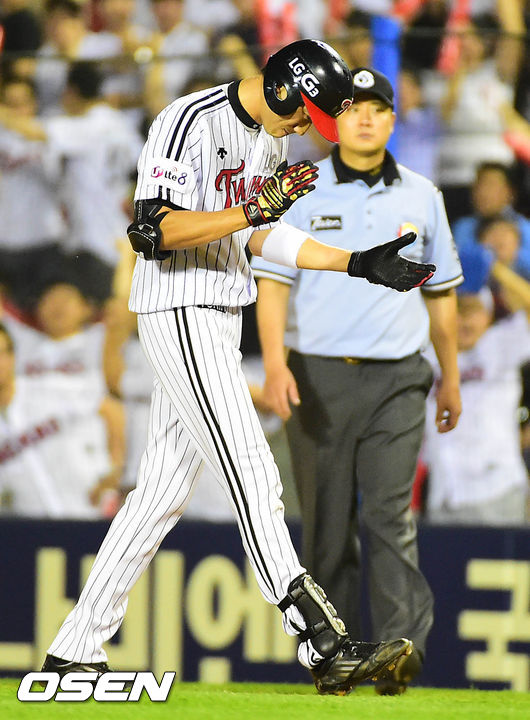 8일 오후 서울 잠실구장에서 열린 2014 한국야쿠르트 세븐 프로야구 LG 트윈스와 두산 베어스 경기, 5회 말 2사 만루 상황에서 2타점 적시타를 날린 LG 김용의가 기뻐하고 있다.