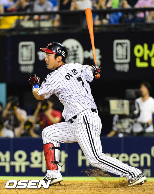8일 오후 서울 잠실구장에서 열린 2014 한국야쿠르트 세븐 프로야구 LG 트윈스와 두산 베어스 경기, 5회말 무사 1,2루 이병규가 1타점 적시타를 날리고 있다.