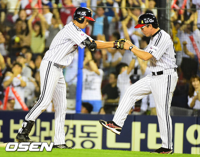 8일 오후 서울 잠실구장에서 열린 2014 한국야쿠르트 세븐 프로야구 LG 트윈스와 두산 베어스 경기, 5회 말 2사 만루 상황에서 2타점 적시타를 날린 LG 김용의가 김민호 코치와 세레모니를 하고 있다.