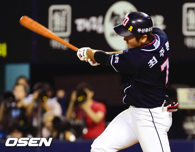 8일 오후 서울 잠실구장에서 열린 2014 한국야쿠르트 세븐 프로야구 LG 트윈스와 두산 베어스 경기, 7회초 2사 1,2루 최주환이 1타점 2루타를 날리고 있다.