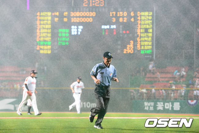 8일 오후 충북 청주구장에서 열린 2014 한국야쿠르트 세븐 프로야구 한화 이글스와 넥센 히어로즈의 경기,8회초 갑작스러운 폭우로 경기가 중단되고 있다.
