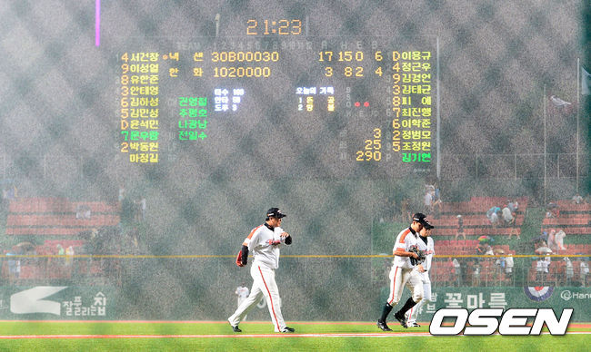8일 오후 충북 청주구장에서 열린 2014 한국야쿠르트 세븐 프로야구 한화 이글스와 넥센 히어로즈의 경기,8회초 갑작스러운 폭우로 경기가 중단되고 있다.
