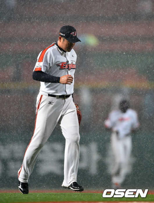 8일 오후 충북 청주구장에서 열린 2014 한국야쿠르트 세븐 프로야구 한화 이글스와 넥센 히어로즈의 경기,8회초 갑작스러운 폭우로 경기가 중단되고 있다.