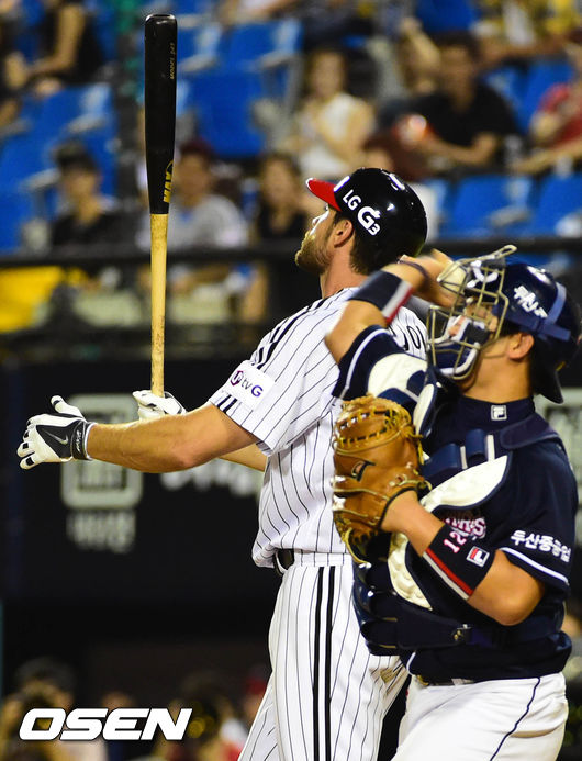 8일 오후 서울 잠실구장에서 열린 2014 한국야쿠르트 세븐 프로야구 LG 트윈스와 두산 베어스 경기, 7회말 1사 주자없는 상황, 헛스윙 삼진 아웃된 스나이더가 배트를 바라보고 있다.