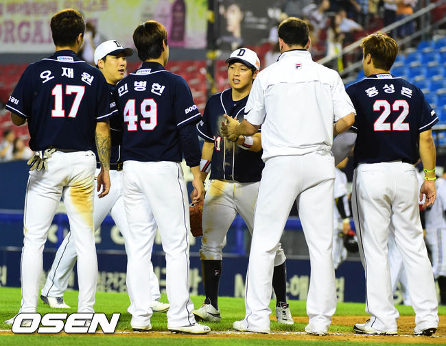 경기종료 후, 승리한 두산 정수빈이 칸투, 민병헌과 하이파이브를 나누고 있다. /ouxou@osen.co.kr