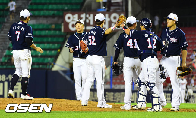 경기종료 후, 승리한 두산 선수들이 기쁨의 하이파이브를 나누고 있다 . /ouxou@osen.co.kr