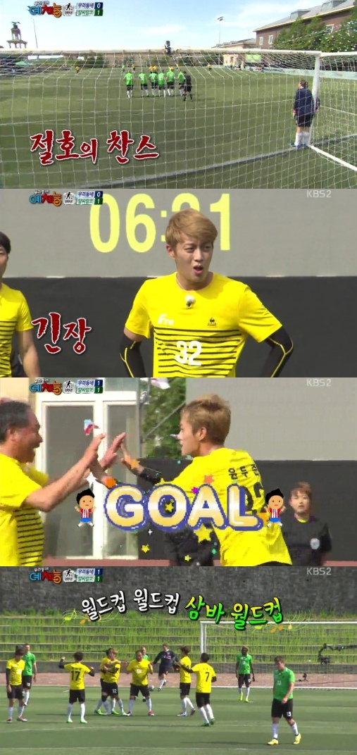 윤두준은 골을 성공시키자 우리동네 FC 멤버들과 함께 삼바춤으로 골 세레모니를 선보였다. 이에김흥국은 ‘삼바 월드컵’ 노래를 부르며 첫 골의 기쁨을 함께 만끽했다.