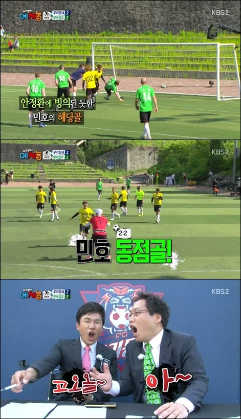 민호는8일 방송된 KBS 2TV 예능프로그램 '우리동네 예체능'에서 우리동네 FC의 두 번째 골을 성공시켰다.