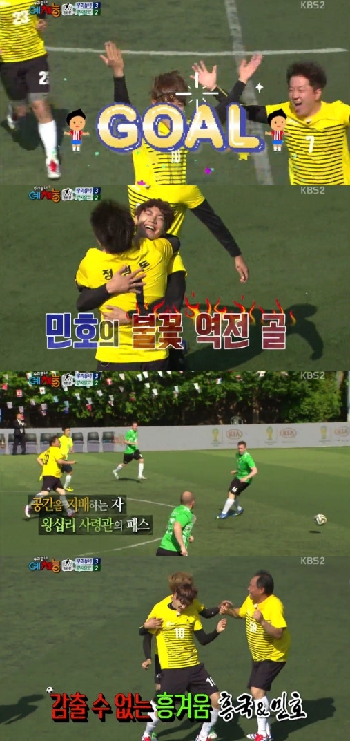 ‘우리동네 예체능’ 김흥국과 민호과 환상호흡을 과시하며 감격적인 역전 골을 만들어냈다.