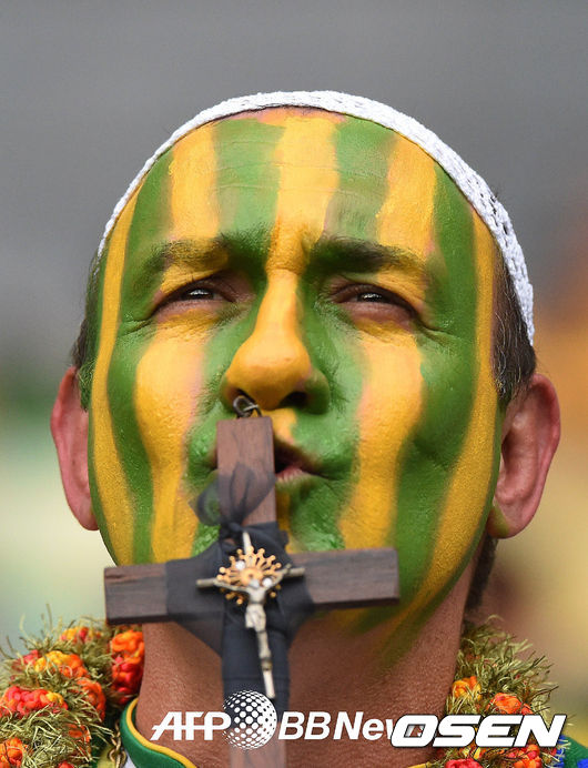 [OSEN=사진팀] 9일 오전(한국시간) 브라질 벨루오리존치 미네이랑 경기장에서 열리는 '2014 브라질 월드컵' 4강전 브라질과 독일의 경기를 앞두고, 브라질 팬이 십자가에 키스하며 승리를 기원하고 있다.