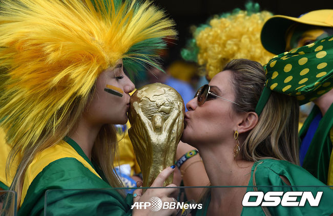 브라질 미녀팬들이 모형 월드컵 우승 트로피에 키스하며 응원을 펼치고 있다.