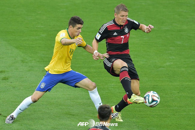 전반 브라질 오스카와 독일 슈바인슈타이거가 볼다툼을 벌이고 있다.