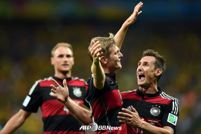 전반 독일 토니 크로스가 팀의 세 번째 골을 넣은 뒤 동료 클로제와 함께 환호하고 있다.