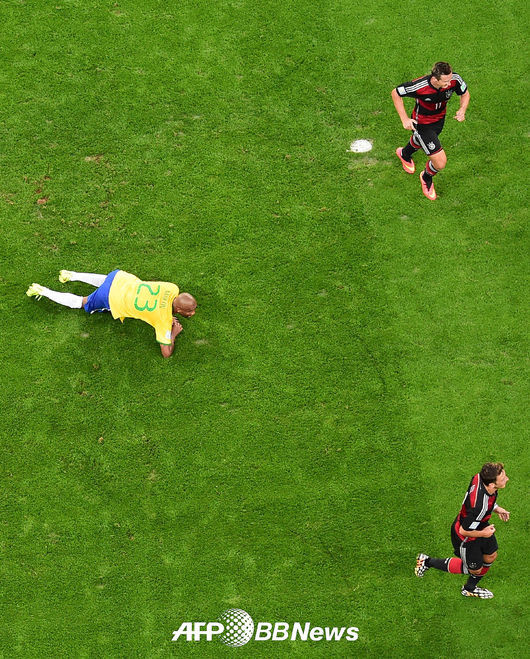 전반 독일 클로제가 팀의 두 번째 골을 성공시킨 뒤 팀 동료 외질과 함께 환호하고 있다. 그라운드에 누워 아쉬워하는 브라질 마이콘. 한편 클로제는 이 골로 월드컵 통산 16골로 최다골 기록 갱신했다.