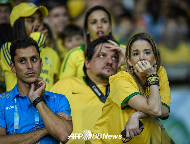 브라질 축구팬들이 연속 골 허용 장면을 지켜보며 안타까워하고 있다./photo@osen.co.kr