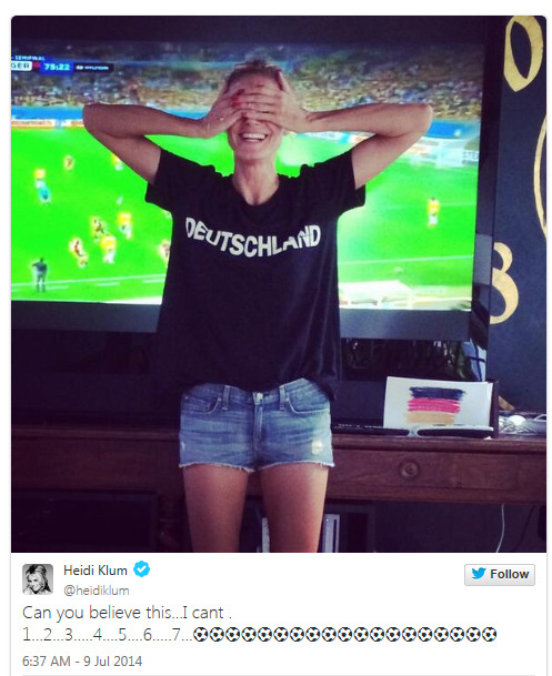 간절히 승리를 노리던 독일팬들조차 믿을 수 없는 결과였다. 독일의 세계적인 모델로, '모델계의 보석'이라 불렸던 독일 출신의 하이디 클룸은 자신의 트위터를 통해 "이 결과를 믿을 수 있어요? 난 믿을 수가 없어요"라며 독일이 넣은 골의 숫자를 올려 놓았다. 하이디 클룸의 반응은 불과 30여분 만에 8000여회가 리트윗 되는 등 널리 퍼지고 있다.