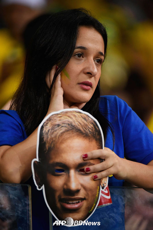 부상으로 월드컵을 마감한 브라질 네이마르의 가면을 든 축구팬이 팀의 연속 골 허용을 바라보며 아쉬워하고 있다./photo@osen.co.kr