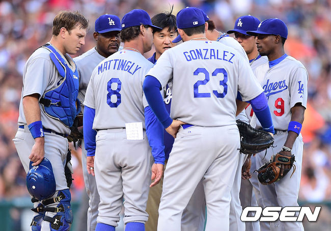 2회말 무사 만루에서 마운드를 방문한 다저스 매팅리 감독이 류현진을 비롯 야수진과 이야기를 나누고 있다.