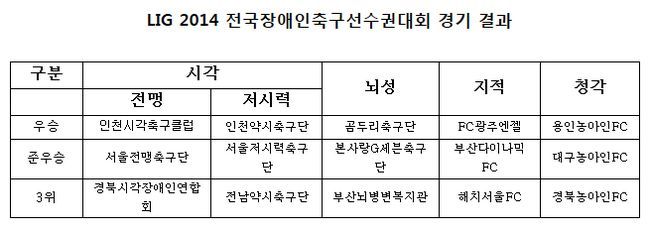 대한장애인축구협회(http://kofad.kosad.kr)는 지난 5일부터 7일까지 사흘간 목포 국제축구센터에서 LIG그룹(www.ligcorp.com)의 후원으로 열린 ‘LIG 2014 전국장애인축구선수권대회’를 성황리에 마쳤다고 9일 밝혔다.