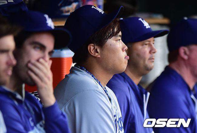 3회초 다저스 류현진이 더그아웃에서 경기를 바라보고 있다.