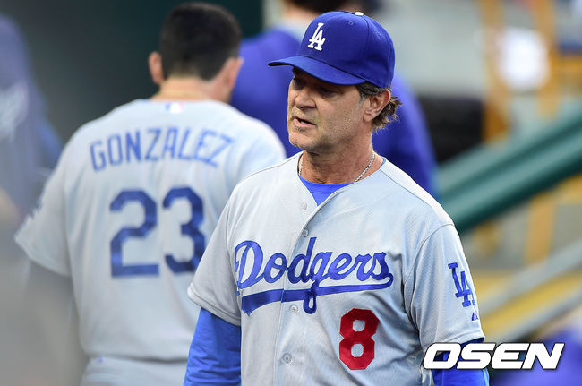 3회말 1사 1,3루에서 다저스 류현진을 강판 시킨 매팅리 감독이 더그아웃에서 아쉬운 표정을 짓고 있다.