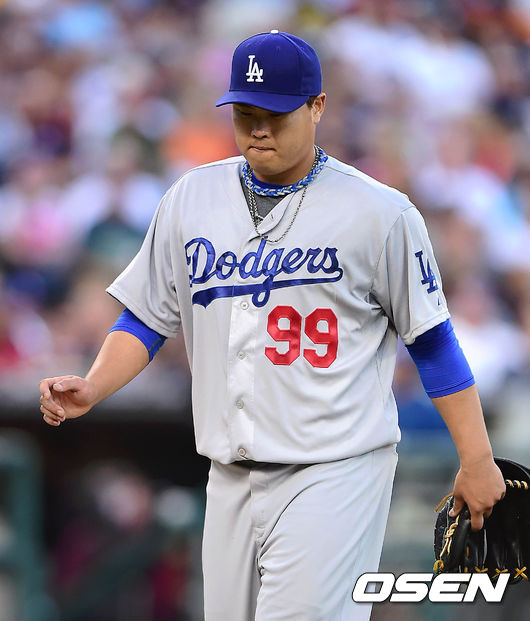 3회말 1사 1,3루에서 다저스 류현진이 마운드를 내려가고 있다.