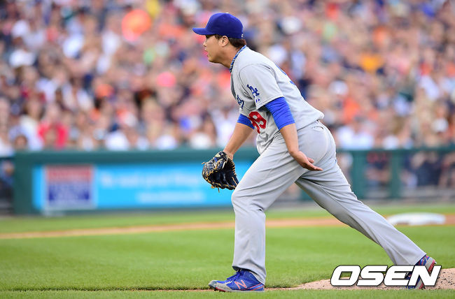 2회말 무사 만루에서 디트로이트 잭슨 타석때 다저스 류현진이 폭투로 실점을 허용하고 있다.