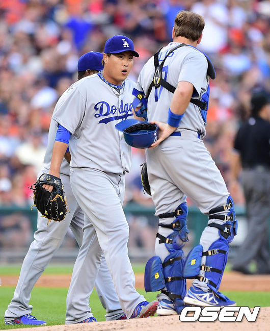 2회말 무사 만루에서 데이비스의 내야안타로 실점을 허용한 다저스 류현진이 아쉬운 표정을 짓고 있다.