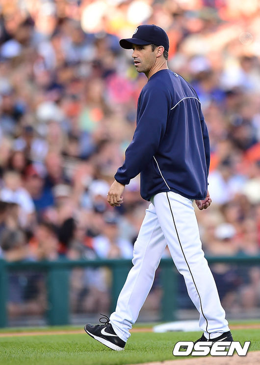 2회말 무사에서 디트로이트 헌터가 우전안타를 치고 2루에서 아웃 선언되자 아스머스 감독이 비디오 판독을 요청하고 있다.
