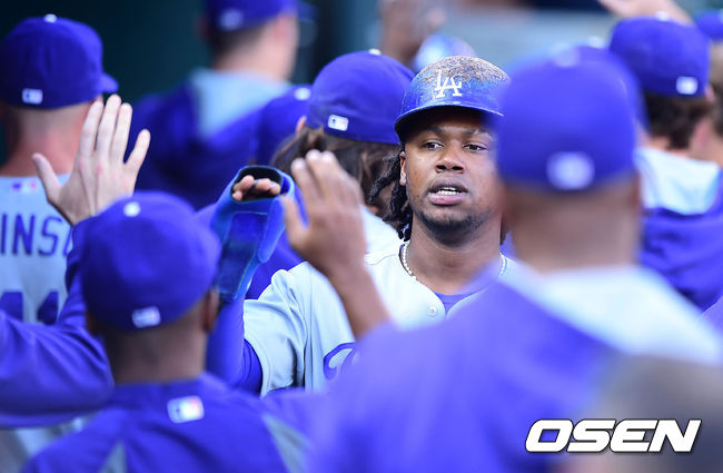 1회초 1사 1,2루에서 다저스 곤잘레스의 우전 2타점 적시 2루타때 홈을 밟은 1루주자 라미레즈가 더그아웃에서 동료들과 하이파이브를 하고 있다.