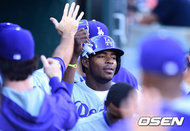 1회초 1사 1,2루에서 다저스 곤잘레스의 우전 2타점 적시 2루타때 홈을 밟은 2루주자 푸이그가 더그아웃에서 동료들과 하이파이브를 하고 있다.