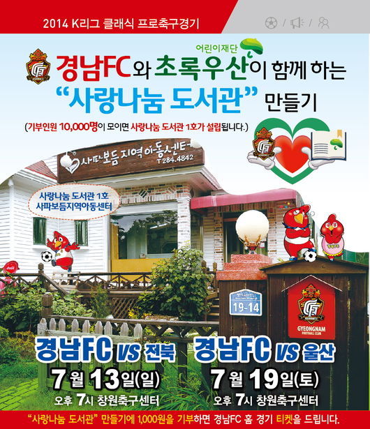 관내 어린이를 위한 공부방 확충을 위해 기획한 이 프로그램은 초등학생에게 1000원에 티켓을 판매하고, 그 수익금을 초록우산 어린이재단에 해당 학생 이름으로 기부하는 프로그램. 경남FC는 수익금으로 ‘경남FC 사랑 나눔 도서관’ 1호점을 개관하는 것이 목표다.