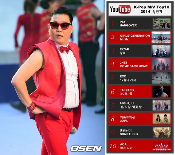 9일 유튜브가 발표한 '2014년 상반기 유튜브 인기 영상 및 채널'에 따르면 올해 상반기 전세계 유튜브 이용자들이 가장 많이 본 K팝 뮤직비디오는 싸이의 '행오버'였다.