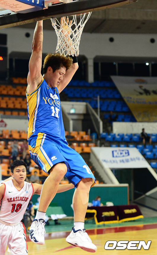 9일 오후 서울 잠실학생체육관에서 벌어진 'KCC와 함께하는 2014 아시아-퍼시픽 대학농구 챌린지' 준결승전, 연세대(한국)와 브리검영대(BYU,미국)의 경기, 1쿼터 연세대 김준일이 빠른 속공을 바탕으로 덩크슛을 성공시키고 있다.