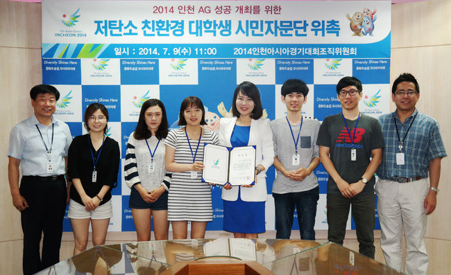 2014 인천아시아경기대회 조직위원회(위원장 김영수)는 국내 최초로 탄소 감축 및 상쇄 개념이 도입되는 인천아시안게임의 성공적 개최를 위해 9일 오전 송도 미추홀타워 조직위 대회의실에서 저탄소친환경 대학생 시민자문단 10명을 위촉했다.