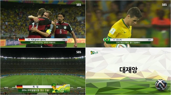 SBS는 9일 새벽 5시 (한국시각) 브라질 벨루오리존치 에스타디오 미네이랑에서 펼쳐진 2014 브라질월드컵 4강 독일과 브라질의 경기를 중계했다. 이날 독일은 브라질을 상대로 7-1 대승을 거두고 결승에 진출했다.