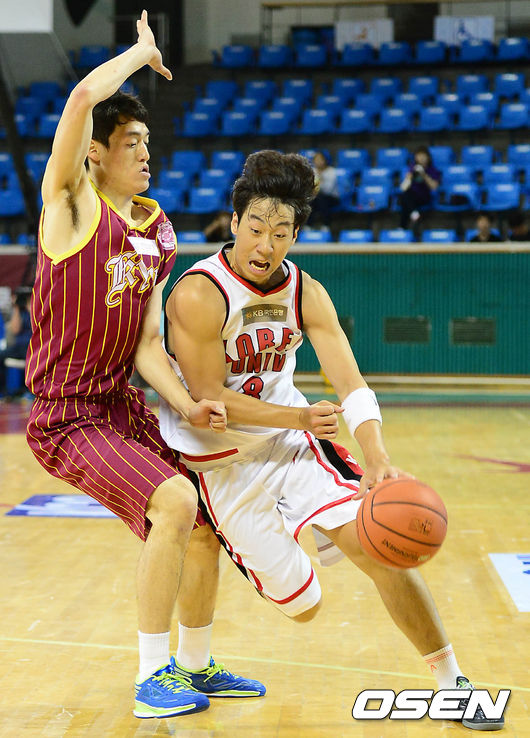 9일 오후 서울 잠실학생체육관에서 벌어진 'KCC와 함께하는 2014 아시아-퍼시픽 대학농구 챌린지' 준결승 고려대(한국)와 경희대(한국)의 경기, 1쿼터 고려대 김지후가 돌파를 시도하고 있다.