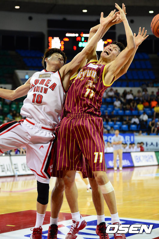 9일 오후 서울 잠실학생체육관에서 벌어진 'KCC와 함께하는 2014 아시아-퍼시픽 대학농구 챌린지' 준결승, 고려대(한국)와 경희대(한국)의 경기, 1쿼터 고려대 문성곤과 경희대 한희원이 리바운드볼을 다투고 있다.