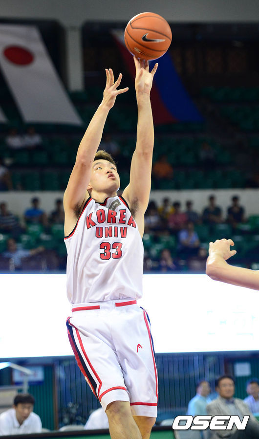 9일 오후 서울 잠실학생체육관에서 벌어진 'KCC와 함께하는 2014 아시아-퍼시픽 대학농구 챌린지' 준결승, 고려대(한국)와 경희대(한국)의 경기, 2쿼터 고려대 이승현이 깔끔한 동작으로 슛을 시도하고 있다.