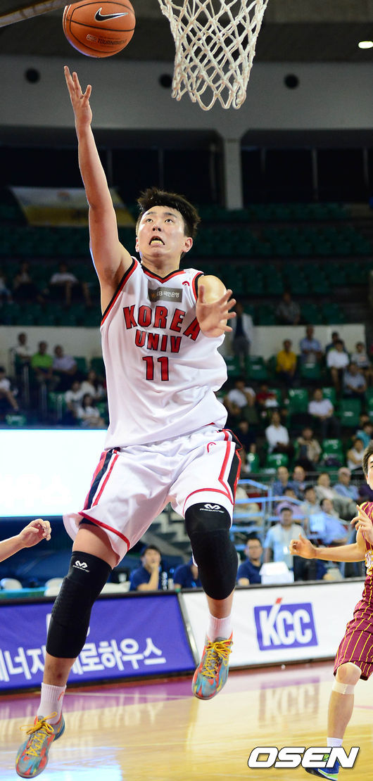 9일 오후 서울 잠실학생체육관에서 벌어진 'KCC와 함께하는 2014 아시아-퍼시픽 대학농구 챌린지' 준결승, 고려대(한국)와 경희대(한국)의 경기, 1쿼터 고려대 강상재가 몸을 날려 레이업슛을 시도하고 있다.