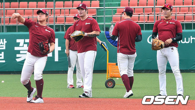 9일 오후 충북 청주구장에서 열리는 2014 한국야쿠르트 세븐 프로야구 한화 이글스와 넥센 히어로즈의 경기에 앞서 넥센 선수들이 수비 연습을 하고 있다.